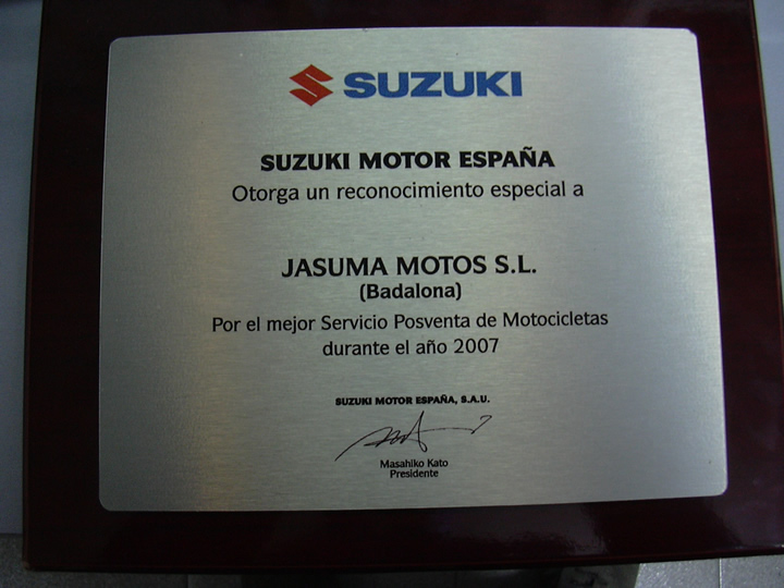 Jasuma lo forma un equipo de mecánicos profesionales con el objetivo de ofrecer el mejor servicio, por ese motivo Masahiko Kato, Presidente de Suzuki otorgó un reconocimiento especial a Jasuma Motos por el mejor servicio Posventa de motocicletas durante el año 2007.
